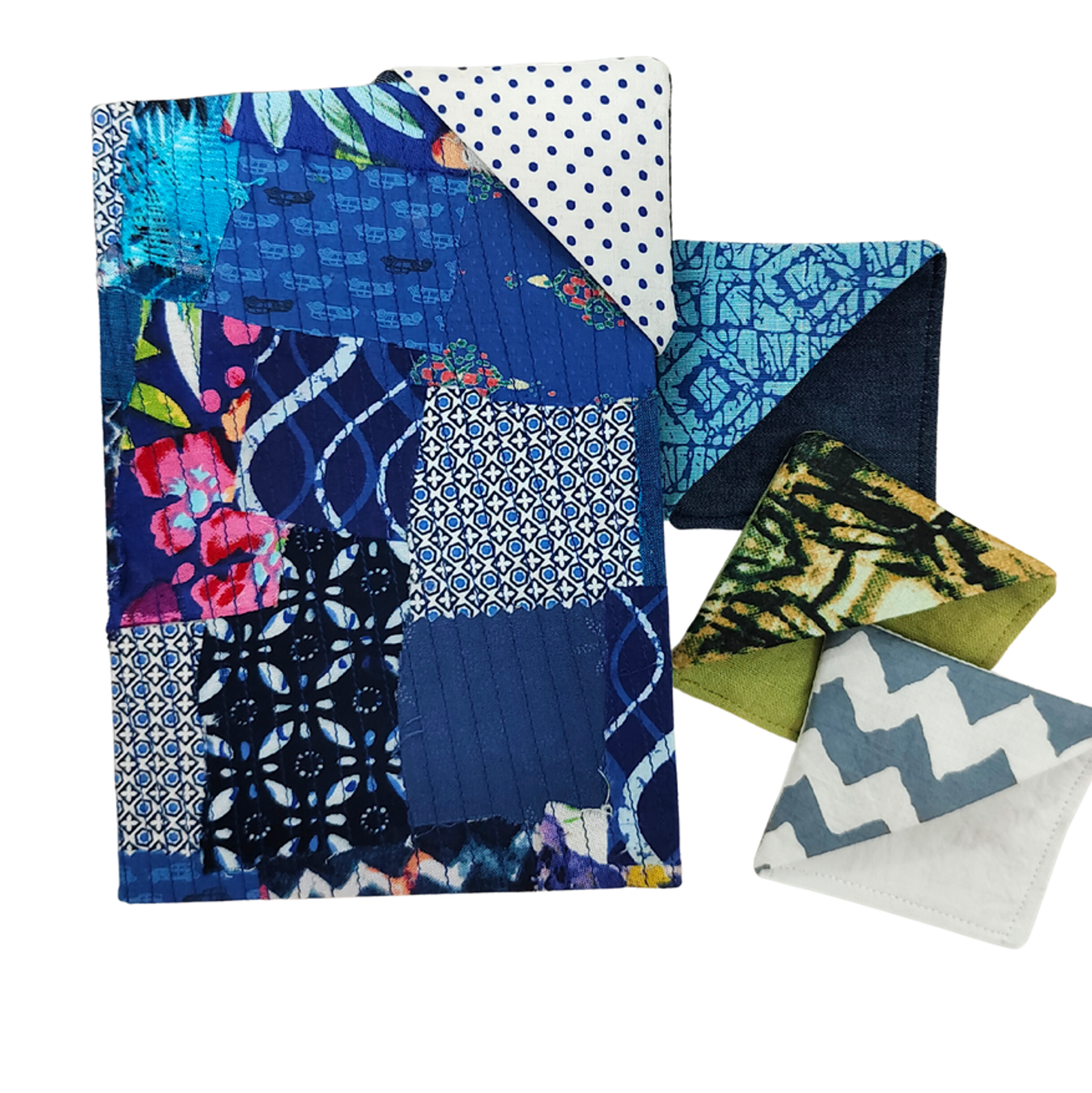 A triangular corner-style handmade dogear bookmark that sits neatly on the page without damaging it. Made from colourful upcycled fabric patches, it is functional, compact, and fun.